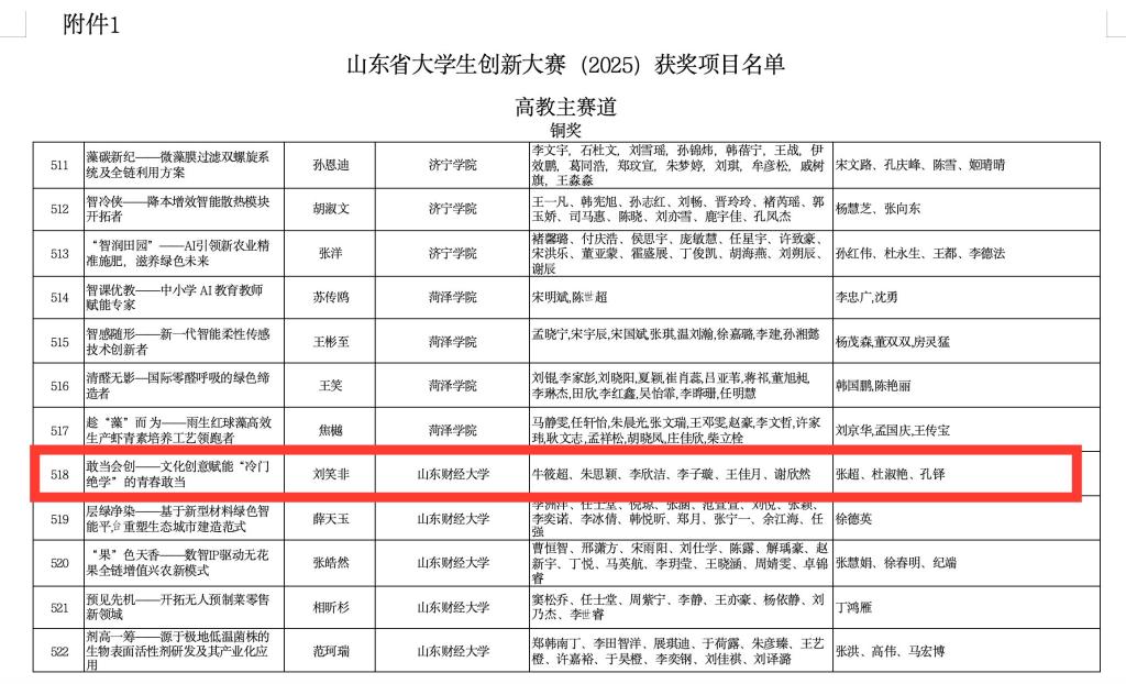 近日,2025年“建行杯”山东省大学生创新大赛获奖项目名单公布,我院“敢当会创——文化创意赋能‘冷门绝学’的青春敢当”项目,成功斩获铜奖。